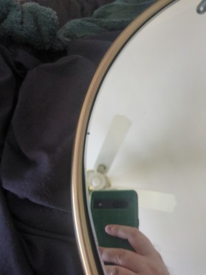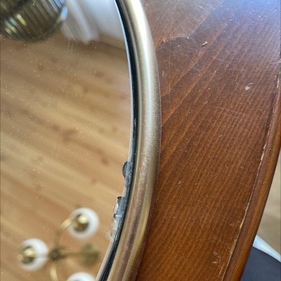 A: Hello Eileen- I am glad mirror caught your eye. The frame is brass in color which is similar to dull gold color- Jennie