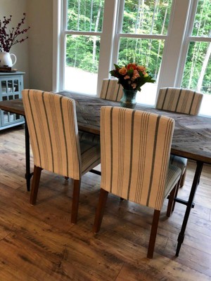 The description says chair is “blue” stripe but it is surely more “green”. The background is more beige than white so is disappointing. Now I will have to buy chair covers rather than go through the hassle of returning them!