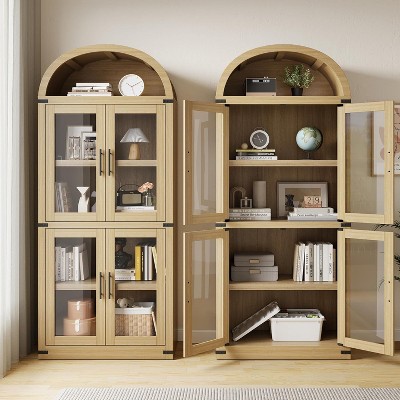 Arched Bookcase with Wooden Doors, 4 Tier Display Bookshelf Storage Cabinet, Floor Standing Organizer for Home Office Living Room, Black