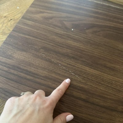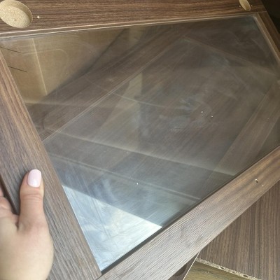 First the glass is frosted plastic on the doors. Very cheap all around. The top rounded piece is a thin piece of fake wood you slid in and it cracked when we inserted it. The drawer is so cheap and sits crooked. Very disappointed