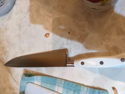 I received product reimbursement in exchange for my honest review. I am so excited about this knife. I love how sleek it looks and now I want an entire set of white knives. I had never heard of this brand but I'm glad to have found it. Its light weight, comfortable to hold, and super sharp. Added bonus is that it's dishwasher safe. I'd highly recommend this chefs knife.