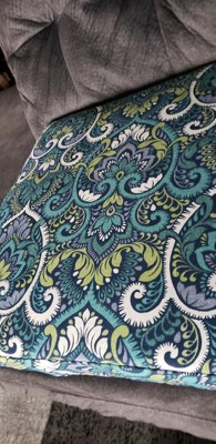 [This review was collected as part of a promotion.] I got the Arden Selections Sapphire Aurora Damask Outdoor Seat Cushion for our chair on our patio. I love the colors and the print. It was only out for a few weeks before winter,but it's colors stayed vibrant and dried quickly. It does have a zippered cover,so it can be taken off to wash. It has the ties on one side to secure it to the chair. The print is on both sides of the cushion. I would buy this cushion