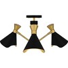 The Arden collection is a striking blend of modern design and functional versatility. The combination of matte black and gold finishes creates a visually appealing contrast, perfectly highlighting the geometric shape. The metal shades rotate in and out, but they can also be turned to face up and down to provide both ambient and task lighting options. Arden is available as a semi-flush mount, wall sconce, or chandelier.