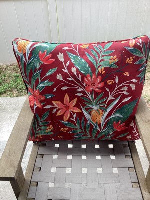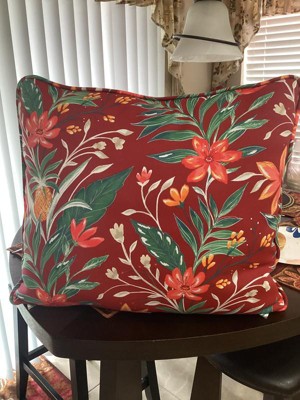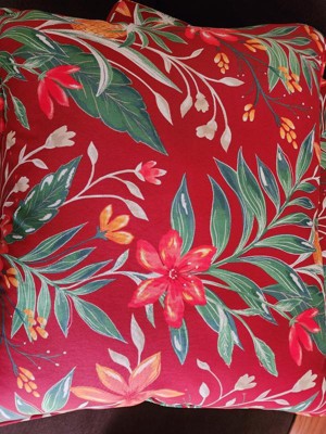 [This review was collected as part of a promotion.] I really like the Arden Selections earthFIBER Outdoor Deep Seat Set in Luau Red Tropical Floral. The set comes with two pieces, one large pillow, and one large seat cushion. Both the cushion and pillow are very comfortable, and the cushion has quite a few inches of softness to sit on. I also like how you can tie the cushion, and pillow onto the chair that you are using. You can easily spot clean them if need be, and the bold color pattern is just beautiful. I am using both on a chair outside on my patio until the rainy season arrives. I have had many compliments on the pattern and color.