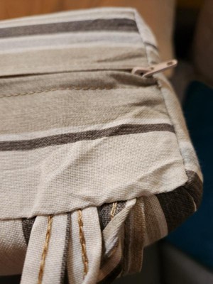 [This review was collected as part of a promotion.] This pillow and cushion are so thick and comfortable. It feels sturdy and will last outside for a long time!! Its thick and I love that!! Most of the time, the cushion is thin and then just gets uncomfortable. I love the colors and stripes!!