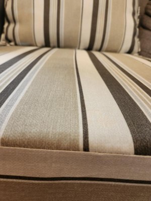 [This review was collected as part of a promotion.] Outdoor single set cushions is a three tone stripe design with the bottom cushion being 24×24×4.75 medium hard seat and the back upper cushion is 20x22 soft cushion . Made by Arden Nice pattern of stripes three tone gray/brown colors are a nice touch to the appearance will make any chair or rocker look nice.