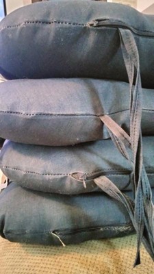 [This review was collected as part of a promotion.] I received these 4 navy blue outdoor cushions. They are rain proof and fade resistant. They are smaller that most chairs, but still provide a comfy cushion instead of sitting on a hard chair. I added them to my outdoor table set for us to use as we enjoy the outdoors.