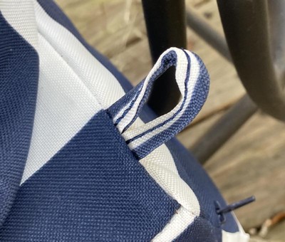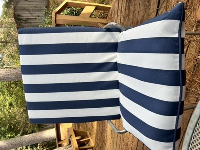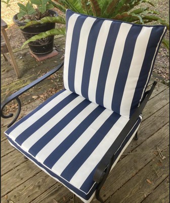 [This review was collected as part of a promotion.] The cushions on my patio set are OLD so I was excited to give one of my chair a little makeover. This Arden Selections set includes both the seat and back and the sapphire blue/white stripe is gorgeous! The generous 24x24 size fit my oversized chairs perfectly. Both cushions include little loops to attach to the chair, but they are closed loops - so unlike cushions with ties or velcro these are not easy to attach and that was slightly disappointing. You could tie something to the chair and loop it through, however. The cushions seem to be nice quality but I'm glad I have a covered porch as they don't seem as thick/firm/sturdy as I would like. Overall, I really do like this set of cushions and plan to get a few more that match but I think the lifespan on these will be a bit shorter than my last.
