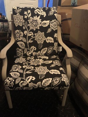 [This review was collected as part of a promotion.] The High Back Dining Chair Cushion by Arden Selections is very comfortable and the perfect thickness. I chose the Ashland Jacobean design and it is beautiful! Great pattern and bright contrasting black on cream colors. Outdoor patio cushion fits the higher back patio chair and measures 44 x 20 in. I have my stuff stored inside for the winter but posted a quick pic!