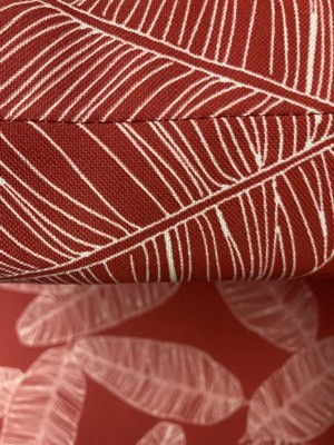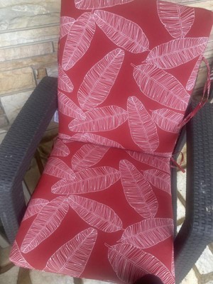 [This review was collected as part of a promotion.] The Arden selections outdoor dining chair cushion has a beautiful red leaf palm pattern for a very appealing look. Great piece for patio, lawn or pool furniture. It is water and uv ray resistant so no need to remove everytime.