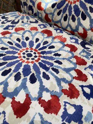 [This review was collected as part of a promotion.] This is a beautiful cushion with a pretty pattern and bright colors. My other cushions are neutrals so having this as a statement piece looks really nice! The cushion is not super thick but comfortable enough. It’s easy to wipe down and clean. I love having this cushion!