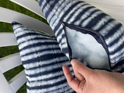 [This review was collected as part of a promotion.] My Arden Selections Outdoor Square Throw Pillows in Blue Shibori Stripe 2 pack are the perfect addition to my porch furniture. They have the zip feature so I can remove the stuffing for easy washing. The shell washes up like brand new. We use ours to set in our laps and use our internet devices. They are nice to use behind my back at times also.
