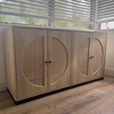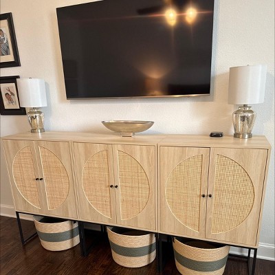 Combining retro design with modern geometry, the Ardon storage cabinet adds value to any space. Made in China, this striking piece combines natural rattan with a sturdy wood and metal frame for a tranquil, carefree display that exudes warmth. Two large shelves behind the doors offer ample space to organize and declutter busy areas of your home. Requiring assembly, the doors of the Ardon feature natural rattan accents for a charming, exotic touch. With a crisp and clean silhouette, the Ardon injects character to any space. Overall Dimensions: 40.90" High x 26.80" Wide x 15.70" Deep; Legs: 14.40 "High; Storage Behind Door Dimensions: 25.60" Wide x15.60" Deep x 25.80"High; Door Dimensions: 25.50" Long x12.50" Wide;