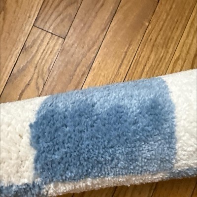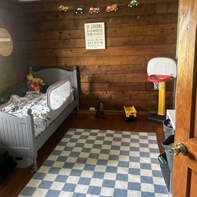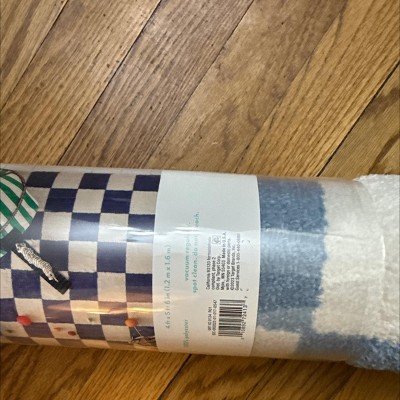 A: The rug features a dusky blue and cream checkered design for a classic look.
