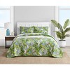Our Tommy Bahama Aregada Dock quilt was inspired by a tropical oasis. Our Tommy Bahama Aregada Dock quilt features a green palm leaf design on a blue ground with a blue reverse. This quilt is 100% cotton, with a cotton (80%)/polyester (20%) filling, lightweight and easy to layer. The shams feature a two piece back closure. The corners of the quilt are rounded to match the sham, both edges are finished with a fabric binding. This quilt set is fully reversible. We have reduced our packaging, eliminating all plastic. Your quilt set will arrive secured with a ribbon. The set includes 1 quilt and 2 shams (1 sham for the twin set). Machine washable, for easy care.