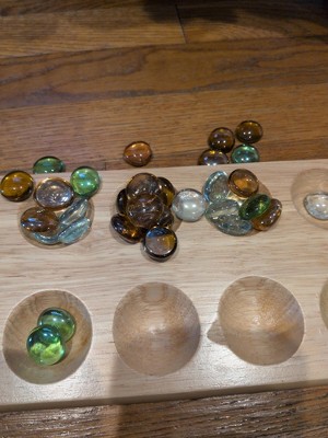 The glass stones given with the board are way too big for the indents in the board. Each indent can hold only 4-5 stones and then the stones start overflowing and falling into other spots. The stones need to be much smaller! We had to buy other smaller ones to be able to properly play.