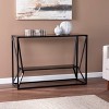 Add sleek storage to your living space with this glass-top sofa table. A wide glass tabletop displays framed photos or decor pieces, while the faux marble shelf tucks away your shoes or your book collection. With a narrow, small space friendly design, this long console table works in your entryway or behind your living room sofa. Give your home design a modern upgrade when you add this glass and faux marble console table.