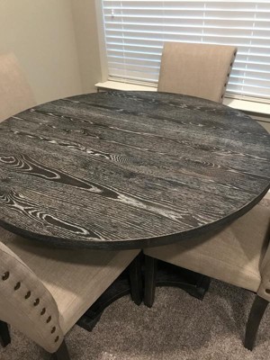 This vintage style Ariane dining table by angelo:HOME is the perfect asset to any dining room, both casual and formal. Made with rubberwood, it features a weathered gray finish with a pedestal base. This table intertwines the shabby and chic style effortlessly. The ornamental pedestal base stands out in any room. Add this to any old-fashioned décor or pair with more contemporary pieces because this trendy table works with numerous dining room styles.