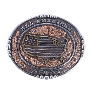 Show off your American pride in bold Western style with this Ariat belt buckle, designed to make a statement wherever you go. This buckle features intricate gold and copper detailing and adds a unique and eye-catching twist to the classic Americana aesthetic. The finely crafted accents create a striking contrast against the traditional background, offering a rugged and refined look. Perfect for rodeos, concerts, or everyday wear, this buckle pairs effortlessly with your favorite leather belt and denim. It fits belts up to 1.5 inches wide, making it a versatile addition to any belt collection. Made of Metal