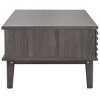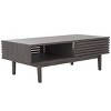 Anchor any room with the modern and airy charm of our Arica coffee table. The sleek design details and streamlined profile make our table a charming and welcoming addition to any corner. A slatted facade adds definition and charm to our airy and linear coffee table. It highlights the natural grains of wood in a distressed black finish. Featuring an open shelf and cabinet, our coffee table features ample space to display your beloved decor items while hiding your knick-knacks behind its sleek cabinet.