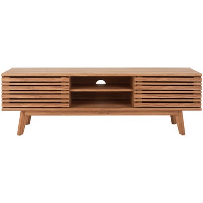 Embrace the practical elegance and versatility of our Aricia small media stand. The sleek design details and streamlined profile make our media stand a charming and welcoming addition to any corner. A slatted facade adds definition and charm to our airy and linear storage unit. It highlights the natural grains of wood in an oak finish. Featuring two open shelves and roomy cabinets, our media console effortlessly grounds and provides adequate storage for any small to medium size television.