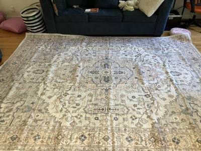 This rug is not peach and beige- it's brown and blue (why??). The print is beautiful and the rug itself seems nice, but it's not what I was expecting. Will sadly have to return as it doesn't match :(