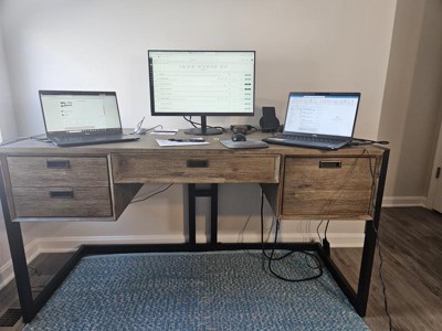 Work in style with the Arley Desk. Combining industrial style and function this desk is crafted of solid Acacia with solid metal legs and frame. Generous in size, this desk offers a spacious top surface and includes a keyboard tray for added convenience. Three side drawers provide plenty of space for small office supplies.