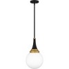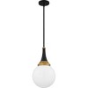 Black and gold create a bold and modern pairing in the Arlo pendant light. The clear opal glass globe is accentuated by a matte black finish and lustrous brass accents at the top. Hang Arlo pendants alone or in a grouping over a kitchen island, bar area, or table for optimal lighting.