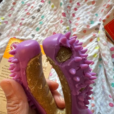 I was looking for a tough chew for my one year old dog. This is great except for the purple plastic part. My dog immediately started chewing that part off, easily, and eating it. I had to take this away almost immediately because he was eating the purple plastic. I saw it in his poop for days. That part should be removed. I expected more from this brand.