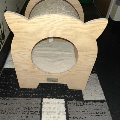 - The cat hideaway wood scratcher is covered in natural sisal fibers.
