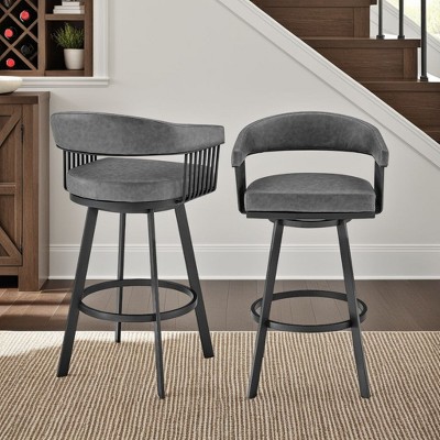 Bring sophisticated style and comfort to your home with our Athena Upholstered Swivel Bar or Counter Stool. With bentwood construction, our bar stool features a stunningly streamlined and striking barrel back. Its sleek and eye-catching curves are complemented by an airy metallic frame and splayed legs for a stunning visual impact. An enveloping silhouette and padded seat promise a comfortable sit in a kitchen or lounge. Our barstool is available in both faux leather and high-performance fabric to best suit the daily wear and tear of your home. Expertly crafted from metal and engineered wood, the counter stool shows off a mixed material elegance to work well anywhere from your kitchen to a home office. It can complement a kitchen island, pub table, home bar, or adjustable desk, bringing a dose of style and comfort. Our modern bar stool comes with a wonderful 360-degree swivel with a smooth gliding system, allowing you to join conversations around the counter or work with ease and efficiency. The Athena swivel bar or counter stool easily incorporates into any home and is available in your choice of 27-inch or 31-inch seat height in a walnut wood finish with black, cream, and gray faux leather upholstery or a black wood finish with your choice of light gray or blue fabric or gray faux leather upholstery.