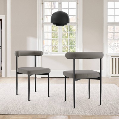 Transform any space with the luxurious charm and comfort of the Morgan Dining Chair in Fabric and Metal - Set of 2 by Armen Living. The cozy yet streamlined profile of our chair offers comfort with a touch of opulence. Its beautifully curved back and seamlessly flowing arms lend refinement to this dining chair and any room you put it in. The back, arms, and seat cushion are fully upholstered to offer hours of comfort. The Morgan chair is covered in performance fabric, which provides easy care and maintenance. Perched on four slender legs, this dining chair serves as a stylish complement to any contemporary or modern room. From casual to formal meals, elevate your eat-in kitchens and dining rooms to the simple elegance of the Morgan Dining Chair. Beyond dining, it can offer a chic and comfortable accent chair anywhere from your living space to your home office. Available as a set of two, the Morgan Upholstered Dining Chair comes in matte black iron with Light Gray, Charcoal, or Blue Fabric, or brushed stainless steel with Light Gray, Charcoal, or Blue Fabric to bring comfort and grace to your home.
