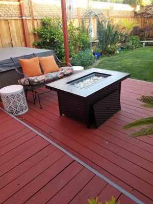 I read reviews and checked specs on many fire tables prior to making the decision to buy this one. Many tables have either glass tops (not good for young kids) or poor quality painted metal that would peel. This table seems well made and came with the glass fire rocks and a cover, which many didn't include. Instructions are easy and its a very nice size and height. The woven mental look is unique to most other tables and is mainly aluminum so won't rust over time. Its a good value for the price.