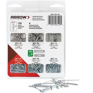 The Arrow rivet assortment kit comes with 6 of the most popular rivets, RSA1/8, RMA1/8, RLA1/8, RSS1/8, RMS1/8, RLS. Each kit comes with 120 pieces total. Package contains popular sized aluminum and steel rivets sized 1/8Inches diameter (short, medium, and long).