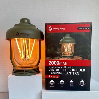 Illuminate your outdoor adventures with the Arrowhead Outdoor® 6-In. LED Camping Lantern. This Olive Green lantern with its vintage-looking Edison bulb, transparent lampshade, and dual-color temperature selection is a powerful and versatile lighting solution for camping, hiking, or any outdoor activity. It boasts a maximum output of 280 lumens, providing ample brightness to light up your campsite or trail. 4 different lighting modes suit your needs, whether you require a powerful spotlight or a gentle night-light. The built-in rechargeable battery delivers extended illumination, ensuring you have light throughout your adventure. Built to withstand the elements, this lantern features an IP6X rating, making it dustproof and water-resistant. The USB-C® charging port allows for easy and efficient recharging using a power bank or wall adapter. And its compact size and included carabiner clip make it easy to carry and hang the lantern from branches, backpacks, or tents._