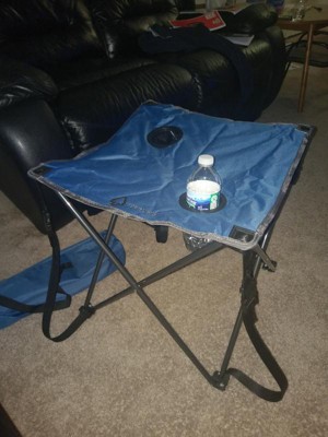 [This review was collected as part of a promotion.] this little table is great for fishing,camping,or just sitting out in the back yard, has a couple drink holders which makes it nice so your drink don't get dumped over, plus enough room to sit multiple other items on it like your phone,small tackle box, ect, i really like the 4 straps on the corners that you can tighten so that the table can not be folded up until you undo the straps, really holds the table in shape, i would recommend this to anyone looking for a small table that easilly folds up to take up very little space.