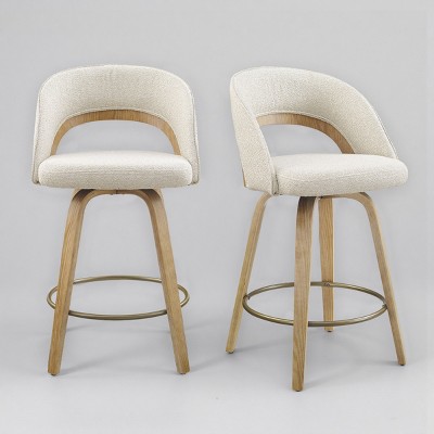 Upholstered swivel counter-height barstools, set of two, offer a choice between luxurious faux leather and elegant fabric. These stools feature a sleek round seat design, complemented by an integrated backrest and armrests that curve gracefully. The sturdy poplar wood frame and legs are finished with a textured wood grain, while a stylish metal footrest adds both functionality and flair.