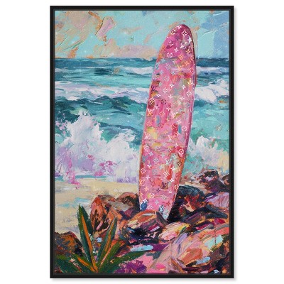 Art Remedy Pink Surfboard on the Beach Colorful Coastal Wall Art, 16" x 24", Black Frame