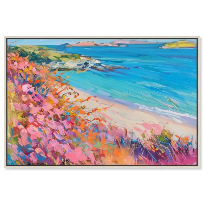 Art Remedy Pink Surfboard on the Beach Colorful Coastal Wall Art, 36" x 54", White Frame