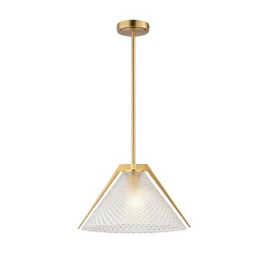 The Baltic Collection designed by Kevin Kraemer, features exquisite semi-transparent glassware with intricately etched diamond patterns, adding a touch of elegance to any table, island or bar. This single light pendant is shown in black and comes with extra rods for easy height adjustability. (Also available with brass framing). Kevin Kraemer design / Black and Brushed Brass finish / Dimmable / 1 x E26 bulb base required (bulb not included) / ETL listed / Limited lifetime warranty / Sloped ceiling compatible. ,