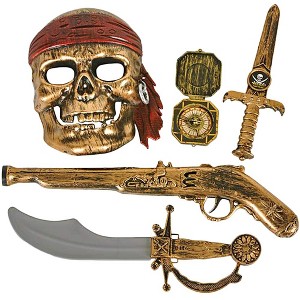 - CAPTURE THEIR IMAGINATION: Wannabe swashbucklers are in for hours of fun! This 5-piece pirate pretend-play set comes with 1 plastic sword, 1 dagger, 1 compass, 1 skull mask, and 1 pistol that produces a putt-putt sound when the trigger is pulled back for immersive fun.