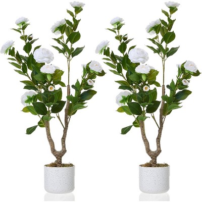 Artificial Camellia Tree, Faux Camellia Plant with White Planter and 16 Pink Flowers, 30" Fake Potted Flower Trees for Home and Office Decor