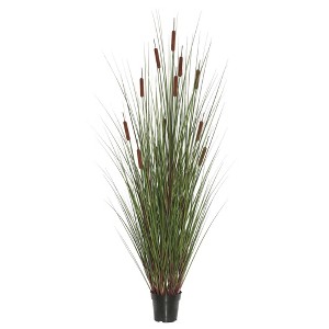 This Vickerman artificial green cattail grass in a black planter's pot makes a great addition to any space. The plant measures 2 feet tall, features 5 brown cattails, and 150 blades of grass. The planter's pot can stand on its own or be nested into the decorative pot of your choice. The pot measures 3.75 inches in height and 5 inches in diameter.
