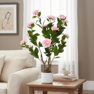 Artificial Hibiscuses Tree 5Ft, Tall Faux Plant Indoor with Realistic Leaves, Red Flowers, Large Trunk, Faux Blooming Tree in White Planter
