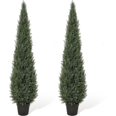 Artificial Topiary Trees, Fake Cedar Trees - Set of 2 Potted Faux Cypress Evergreen Plants, Outdoor/Indoor for Front Porch, Home, Office Decor