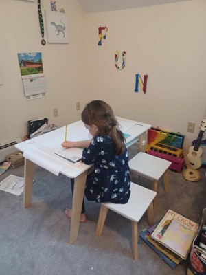 I looked at a few of these and went with this one because I like how the stools go under the table. And I was right. . . my kid likes to stand a lot to do crafts so it's better not to have a chair or bench in the way. The cubby area is big enough. The paper roll doesn't fully cover the table so it gets marked a lot but a magic eraser cleans it right up.