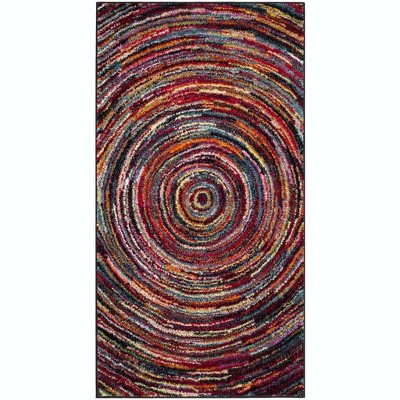 At a versatile size of 2'-7" X 5', this small rectangle rug is perfect for accentuating any room in your home, creating a welcoming and chic atmosphere. The vivid multi-color palette showcases an array of circular patterns that dance across the surface in harmonious tones, bringing a dynamic visual texture and an eclectic vibe to your decor.