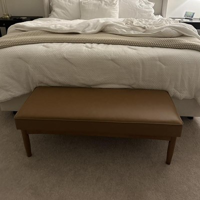 Great price for a faux leather bench. At 17" it is rather short to use next to a dining table, but I love so much I will make due. Coordinates with my cognac leather sofa. Wood accent makes it look high end. If you plan to sit on it a while, it is as hard as a rock. May soften up with time.