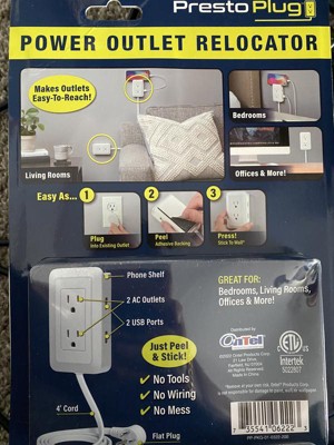 [This review was collected as part of a promotion.] This is so neat! The Presto Plug power outlet relocator makes outlets easy to reach no matter where the original outlet is located. You just peel and stick the outlet where you need it. No tools, wiring or mess! It’s better than a regular extension cord because it has two AC outlets and two USB ports along with a phone shelf along the top that’s super handy. The 4’ long cord makes this perfect for any room.