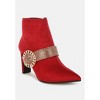 The boots are a piece of art with the intricate rhinestones embellished strap and gorgeous diamante embellished pin buckle detail across the boots. A sophisticated glamorous affair, the boots exhibit an artistic quality with an eccentric silhouette and high quality microfiber finish. Type: Boots Upper Material: Microfiber Outer Sole: TPR Closed Pointed Toe Slim Block Heel Diamante Embellished Pin Buckle Rhinestones Embellished Strap Zipper Fastening Comfortable Cushion Insoles Heel Height: 3.5 inches RCSH5230